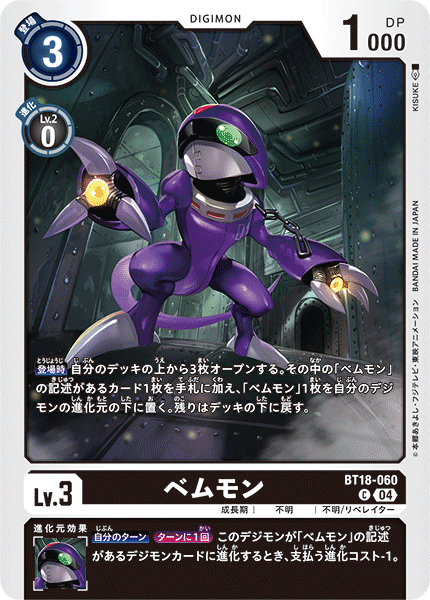 EFFECT | [When Played] Reveal the top 3 cards of your deck. From among them, add 1 card with [Bemmon] in its text to your hand, and place 1 [Bemmon] at the bottom of 1 of your Digimon's evolution sources. Return the remaining cards to the bottom of your deck | ||