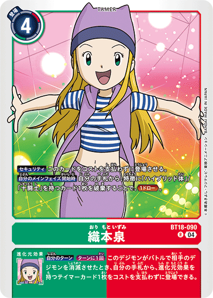 EVO SOURCE EFFECT | [Both Turns] (once per turn) When this Digimon destroys your opponent's Digimon in battle, you can play 1 Tamer card with evolution source effects from your hand without paying its cost |
