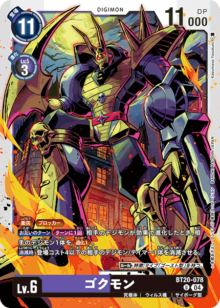 <Collision> <Blocker> [Both Turns] (once per turn) When your opponent's Digimon evolved by an effect, <Devolve 1> 1 of your opponent's Digimon [When Destroyed] Destroy 1 of your opponent's Digimon/Tamer with play cost of 4 or less *[Rule] Traits: Has [Ghost] Type |