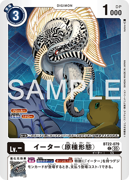 - {Breeding} [Your Turn] [Once Per Turn] When any of your Digimon cards with the [Eater] trait would be played, you may reduce the play costs by 1.