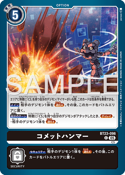While you have a Digimon or Tamer with the [CS] trait on the field, you can ignore this card's color requirements. [Main] <De-Digivolve 4> 1 of your opponent's Digimon. Then, place this card in the battle area. [Your Turn] When one of your [CS] trait Digimon attacks, <Delay>. ・<De-Digivolve 4> 1 of your opponent's Digimon.