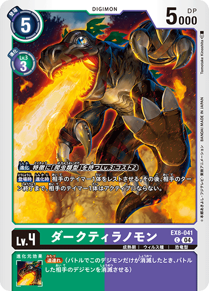([Evolve] Lv.3 with [Reptile] in traits: Cost 2) [When Played] [When Evolving] Rest 1 of your opponent's Tamer. Then, 1 of your opponent's Tamer cannot become Active until the end of your opponent's turn |