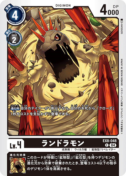 | EVO SOURCE EFFECT | When this card is discarded from the evolution sources of a [Mineral]/[Ore] trait Digimon by effects, destroy 1 of your opponent's Digimon with play cost of 4 or less | ||