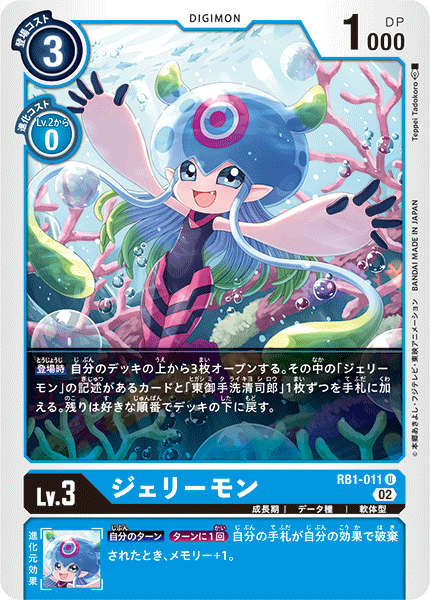 [When Played] Reveal the top 3 cards of your deck. Add 1 card with [Jellymon] in its text and 1 [Higashimitarai Kiyoshirou] among them to your hand. Return the remaining cards to the bottom of your deck in any order