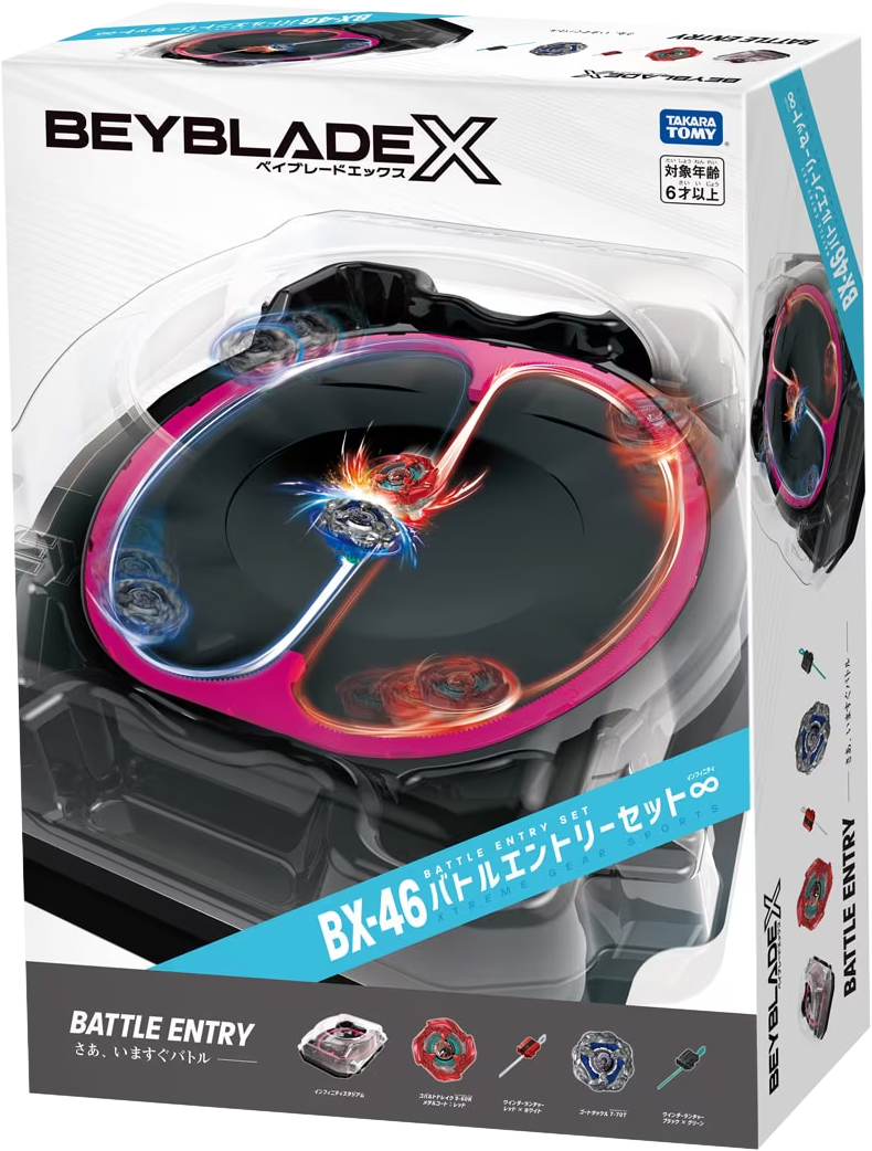 A new stadium, 2 Beyblades, and 2 Winder Launchers are included in the set, and an entry set that allows you to start Beyblade immediately.