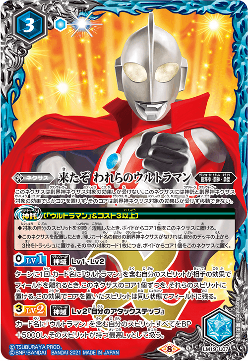All your Spirits containing the name: [Ultraman] gains BP+5000 and is treated as its' highest LV.