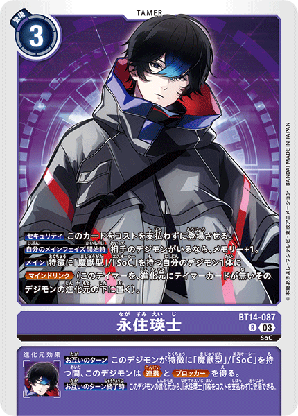[Both Turns] While this Digimon has [Demon Beast]/[SoC] in its traits, this Digimon gains <Alliance> and <Blocker> [End of Both Turns] You can play 1 [Nagasumi Eiji] from this Digimon's evolution sources without paying its cost |